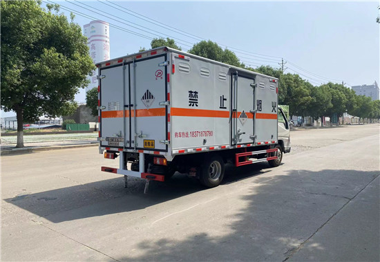 外板采用免漆板及一次性沖壓成型具有防雨功能的通風(fēng)窗,貨廂內(nèi)蒙皮采用合金板有透氣孔,復(fù)合加鉚合工藝,內(nèi)襯為矩形管骨架牢靠穩(wěn)定,貨廂面板內(nèi)外蒙皮之間采用阻燃隔熱材料填充,廂體外部四周鋁合金型材包邊,底板和車廂前下部鋪橡膠皮,后門雙開,可選開側(cè)門,內(nèi)部裝固定貨物的臥環(huán)或護(hù)板,安裝煙霧報警器、防盜感應(yīng)器。車身附件靜電接地帶、滅火器、防火罩、危險品三角燈、橙色反光帶、紅白反光板、菱形標(biāo)志牌、危險品牌、安全告示齊全。